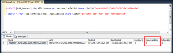 - UPDATE [WSS_Content].dbo.AllListsAux set NextAvailableId=1 where ListID='1ee3cfd5-515f-498f-b3bf-7ef9220e86af'