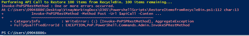 Once connected successfully, it will fetch the items from recycle bin with 100 items in batch and restores up to 2000 items since in this case the batch size is given as 100 and max items to restore are given as 2000.