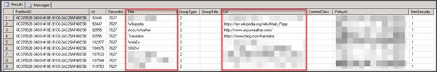 - SELECT[PartitionID], [Id], [RecordId], [Title], [GroupType], [GroupTitle], [Url], [ContentClass], [PolicyId], [ItemSecurity]