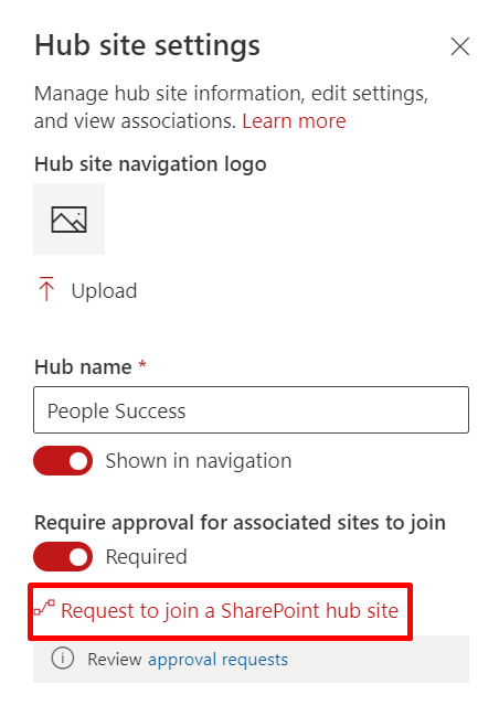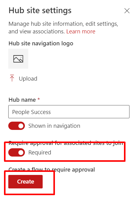 Enable the switch for “Require Approval for associated sites to join” & click on create button for approval flow.