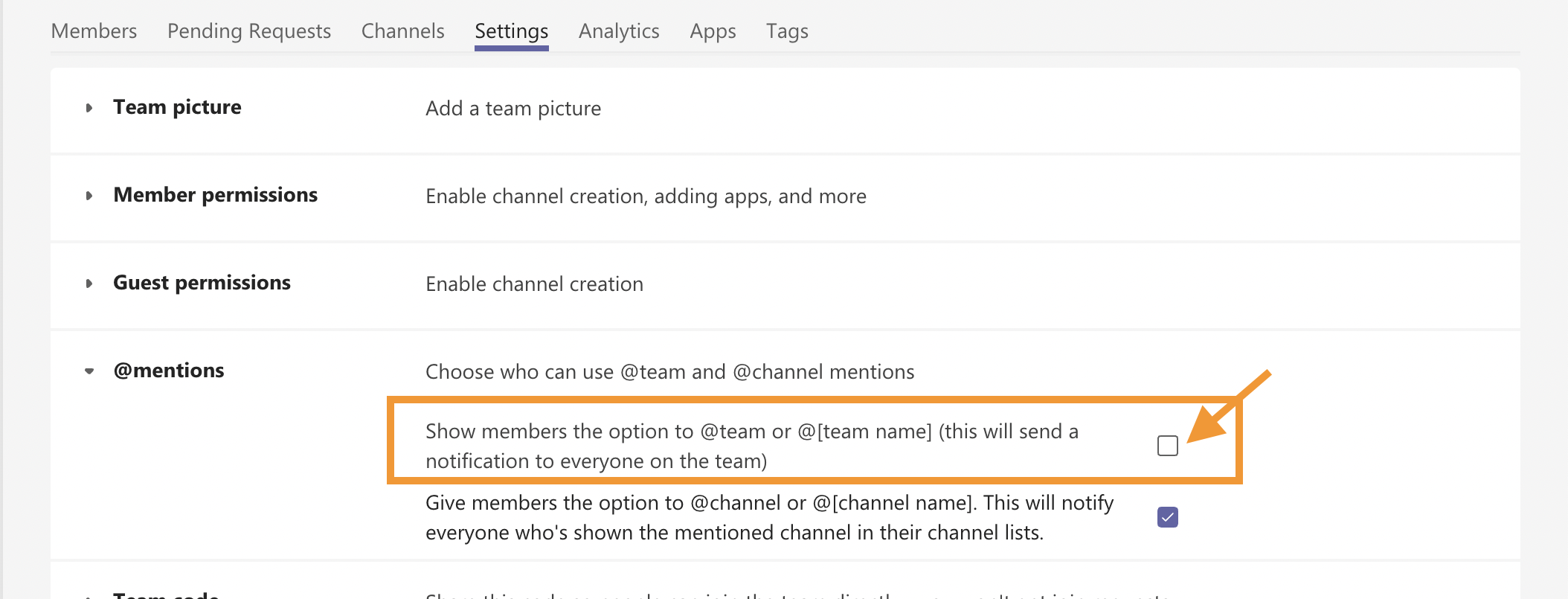 - Uncheck the option "Show members the option to @team or @[team name] (this will send a notification to everyone on the team)". Settings get automatically saved.