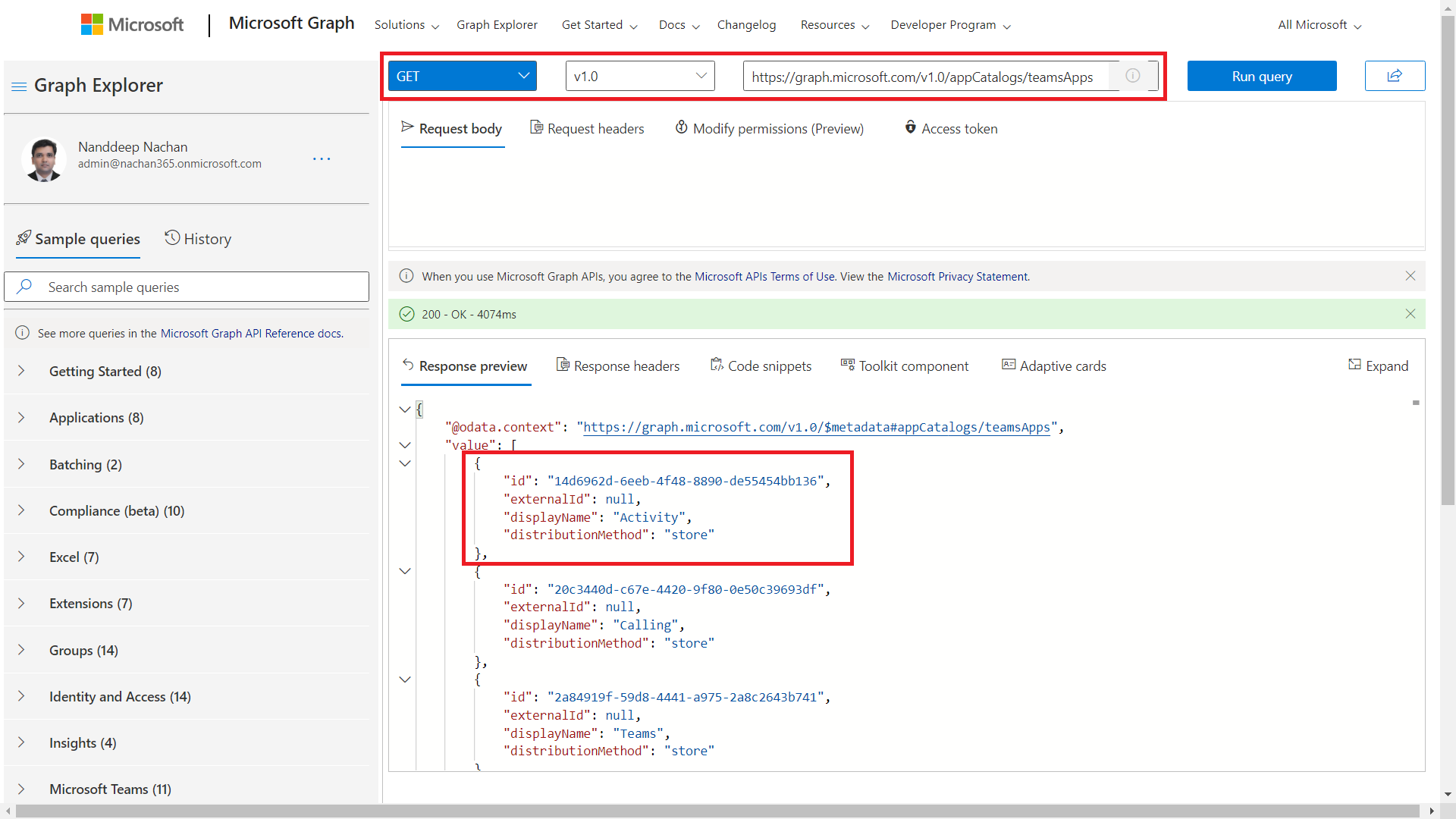 https://graph.microsoft.com/v1.0/appCatalogs/teamsApps?$filter=id eq '05ab3377-bd38-41dc-b917-b05449c13c78'&$expand=appDefinitions&$expand=appDefinitions($expand=bot)
