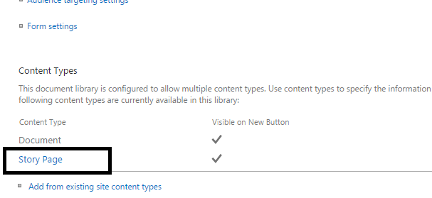 - Click the Story Page content type. If content type is not found, go to the advanced settings and allow the content types.