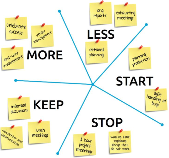 The team starts on a whiteboard where the time line is drawn as shown below and the team discusses: What went well, what did not go well and what should we keep doing.