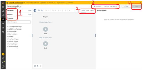 I hope you have created an account for the community edition and installed Bot agent on your machine. We are ready to start creating our first bot where we will show a message box with ‘hello world’ text.