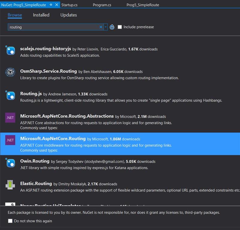 To implement route in the .NET Core Application, first add NuGet package Microsoft.AspNetCore.Routing.