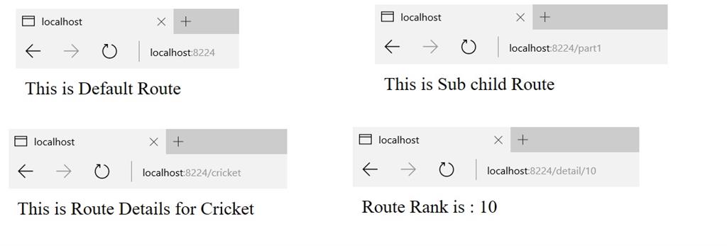 Now, run the project and the the different output is given below, as per the route value.