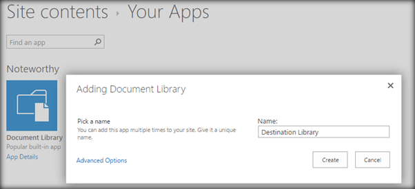 We will need a destination library, to where we will route the uploaded documents conditionally depending on the document’s metadata.