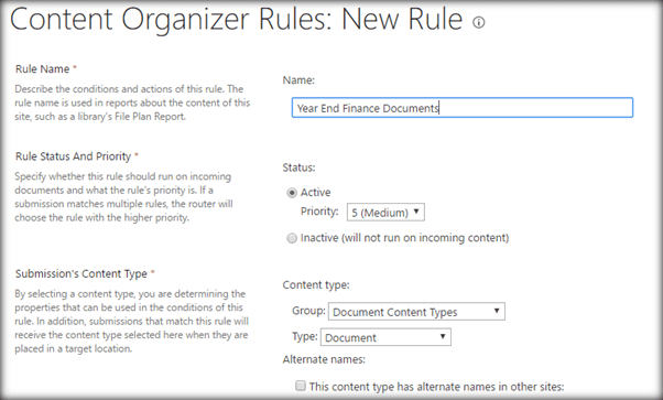 Specify the Rule Name, Rule Status, and Priority. We will have to associate a Content Type with the rule as the routing will be based on Content Type as well as an optional filtering condition. Currently, we will go with Document Content Type.
