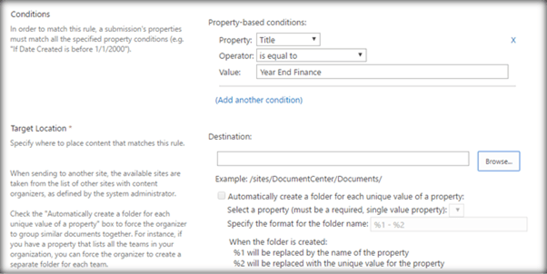 Now, let’s add the extra filtering condition because we don’t have to route all Documents that match the Document Content Type in the destination Library. We will only route documents whose title matches ‘Year End Finance’. This way, only the required documents are routed to the destination library.