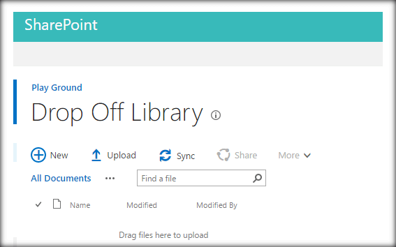 Now, let’s test the document routing capability. Go to the Drop Off library that gets created when we activate the Content Organizer Site feature, and upload a document here.