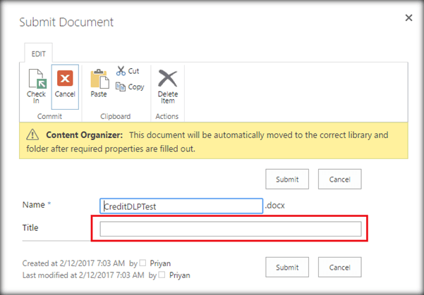 We get the message that the document has been submitted successfully but it has not been routed to the destination library as no Content Organizer Rule was matched. This is because the metadata Title is not set to ‘Year End Finance’.