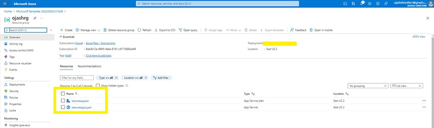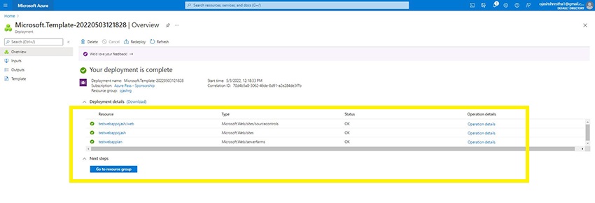Once, the deployment process is successfully complete, we are provided with the link to access the resource group through “Go to resource group”.