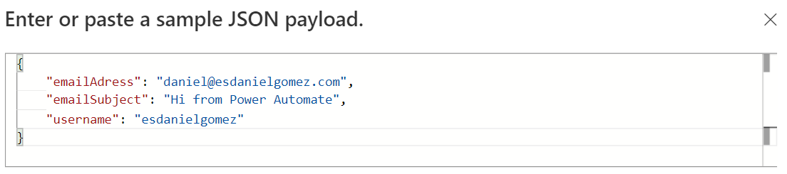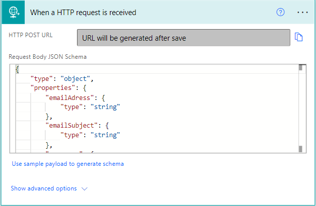 Then, we will need to define the JSON format of our schema for the API. For this, we can use an example by using the option: Use sample payload to generate schema: