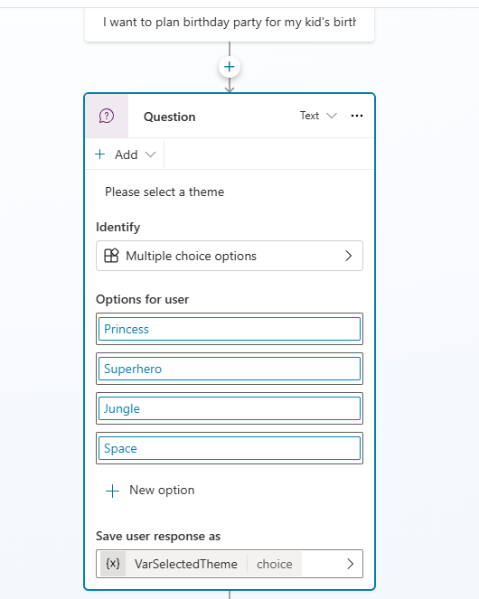 Let the copilot response with theme for selection using action “Ask question” and add available themes in your database. In my case I added themes - Princess, Superhero, Jungle, Space.