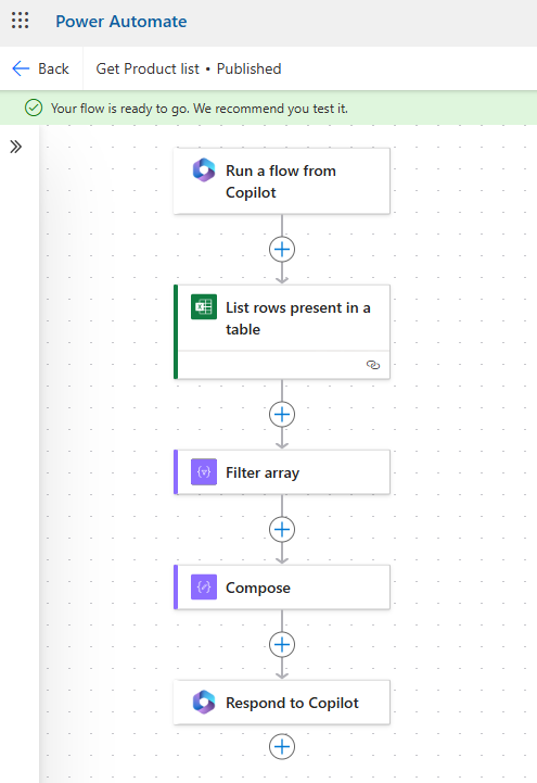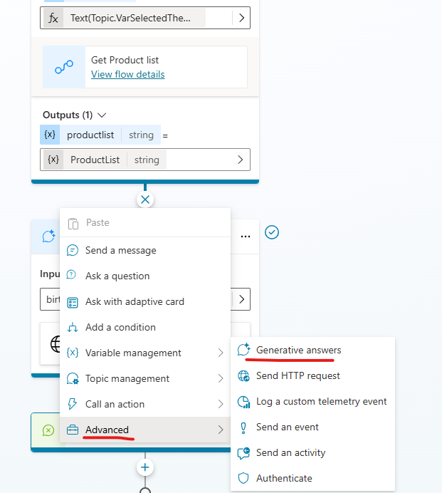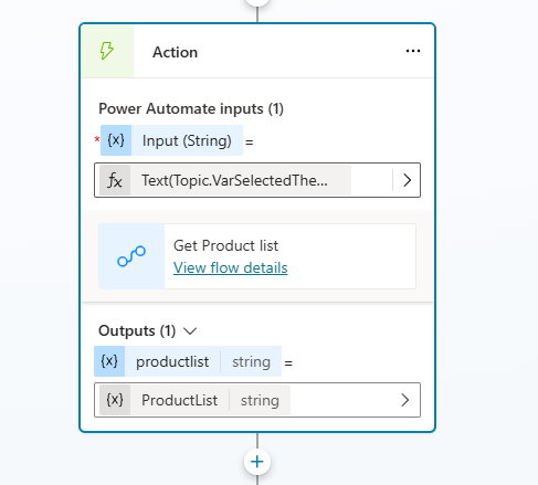 Call Power Automate flow in Copilot studio and store product list in variable “ProductList”.