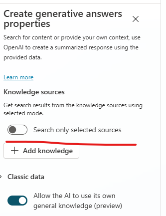 In input add “partyplanner” and edit data source there you can see options like Knowledge sources keep that option off.