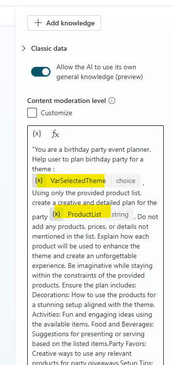 The next option is “Classic data” turn this option on and below that you can see a input for box to give your prompt and use variables there use this given prompt and add variables.