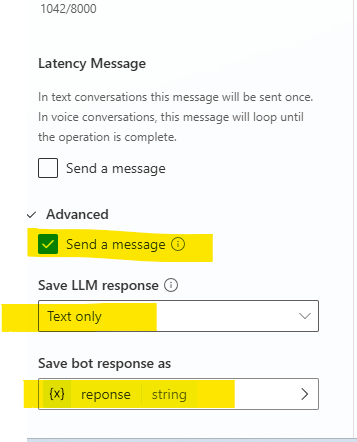 Below this input box you can see option “Adanced” expand that menu there you can see “Send a message” check it so reponse will be automatically go to user. And, in input box “Save LLM response” select “Text Only”. IF you want to save this, put in variable you can save like I saved in “response variable”.