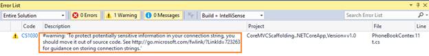 We can see the controller & view are successfully generated using MVC model. In our sample Application, if we notice in the Error List tab , there’s a warning about moving sensitive information from DbContext.