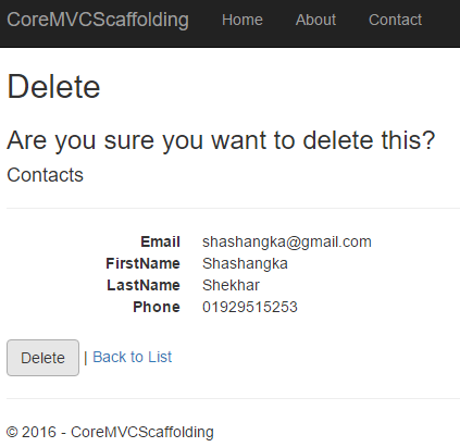 "E:\Documents\Article\ScaffoldingCoreMVC\CoreMVCScaffolding\src\CoreMVCScaffolding" controller --force --controllerName ContactsController --model CoreMVCScaffolding.Models.Contacts --dataContext CoreMVCScaffolding.Models.PhoneBookContext --relativeFolderPath Controllers --controllerNamespace CoreMVCScaffolding.Controllers –useDefaultLayout