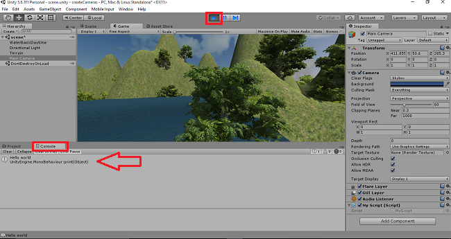 Click on the “Play” button. Game View will be displayed. Click on the console, the hello world messages will be displayed a number of times.