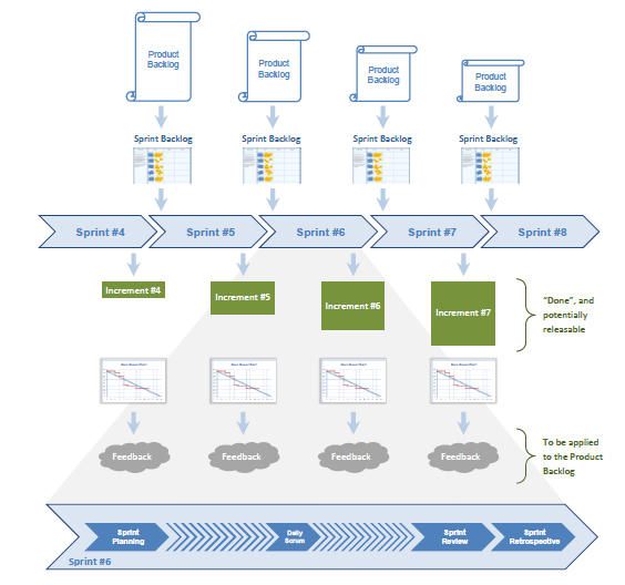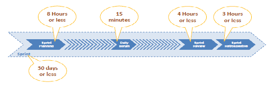 A Scrum project is done through a number of Sprints. Each Sprint is a time box of no more than one month, during which an Increment of a potentially shippable product will be delivered. A Sprint is a container for the following events: