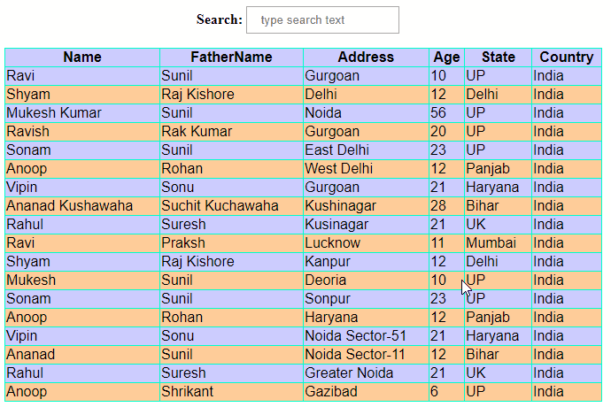 Now when we enter any values for searching in the above input box we will search the record without page posting and without hitting on server-side we will use jquery on keyup event for searching very fast.