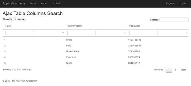 We added table heading as well as added text box for each column. We will be filtering data using corresponding text boxes. Using AJAX, we call the action methods from View to Controller and pass the data as a JSON from controller to view. JSON data will be appended to the tables.
