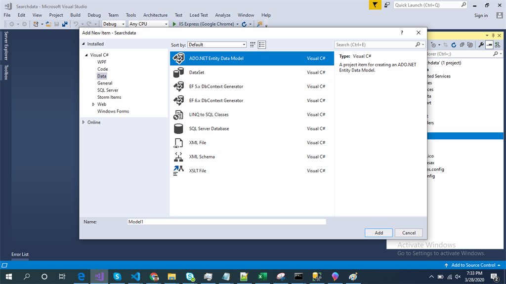 Click on the "ADO.NET Entity Data Model" option and click "Add".