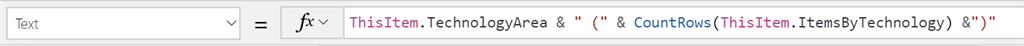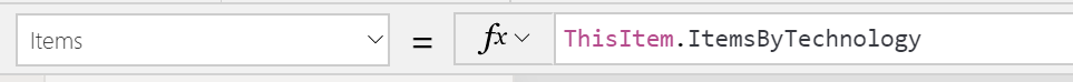 - In the “Items” property of the Gallery Control, set the formula as per the following syntax