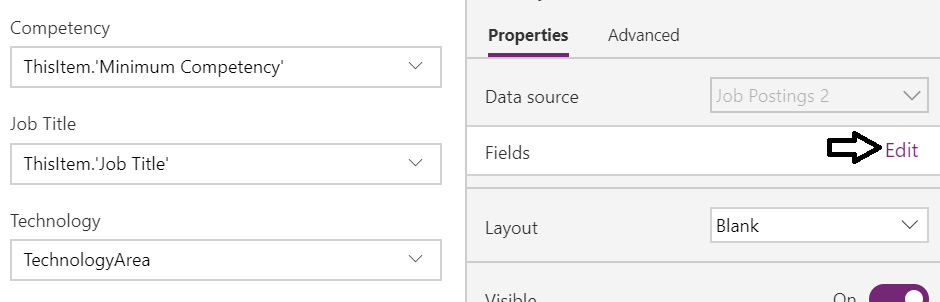 - Now, select the Gallery Control and in the properties panel, for “Fields”, click on Edit and map the labels with desired columns from the datasource.