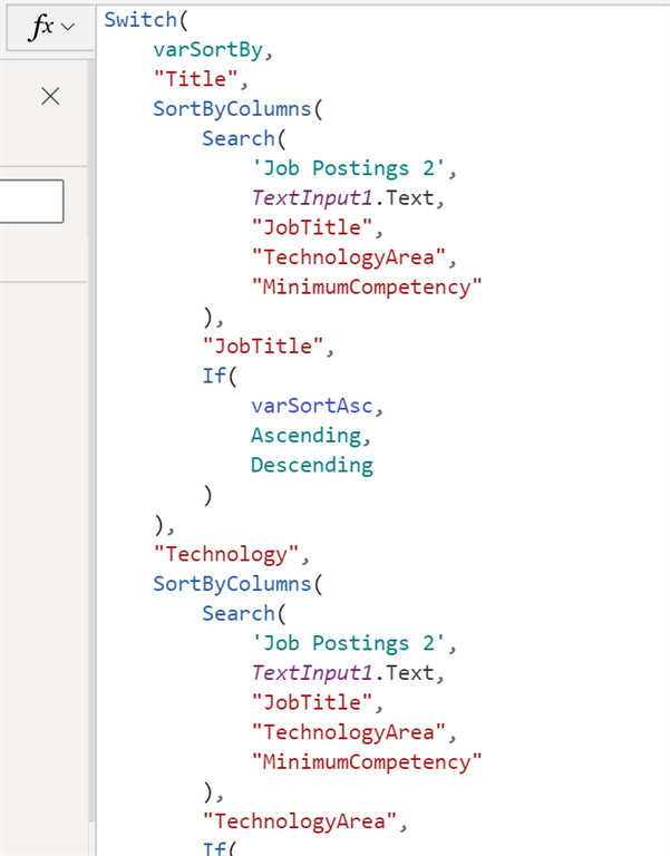 You would have noticed that I have used the “Switch” statement to identify the value of ‘varSortBy’. This simplifies the overall formula instead of multiple “If” statements. Additionally, the Boolean value of ‘varSortAsc’ determines the sort order, each time when the Sort icon is clicked, it will toggle the sort order from Ascending to Descending or vice-versa.