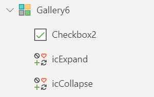 - Edit the Gallery control and add two Icon controls “Right” and “Down”, that will give the experience of expand and collapse of the group. Ensure that both the icons are placed below the Checkbox control in the tree view.