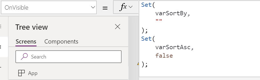 - Now, we will put some formulas on controls to implement the search and sort functionalities. In the “OnVisible” property of the Screen, set the following two variables that will be later used in other formulas: