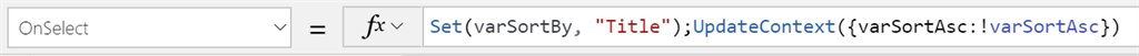 - In the “OnSelect” property for each of the Sort Icon control, set the ‘varSortBy’ variable to a Text Identifier and update ‘varSortAsc’ that will allow sorting in Ascending or Descending order. UpdateContext used here is to toggle the value of the Boolean variable.