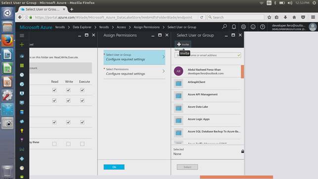 This will take you to "Assign Permissions" blade. Click on "Select User or Group" and click on the "Invite" button to invite users to the Access panel on your Azure Data Lake Store account.