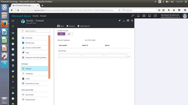 Move to the Data Lake Store Account now and click on "Firewall" under "Settings" panel.
