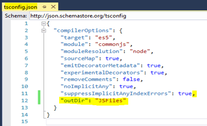 In order to output the JavaScript files to “JSFiles” directory, add the following line under in “tsconfig.json” file.