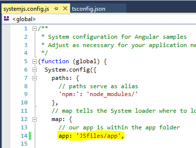 The next step is to change the System Configuration file “systemjs.config.js” to tell the system loader where to find the application files; i.e., JS files to run the application.