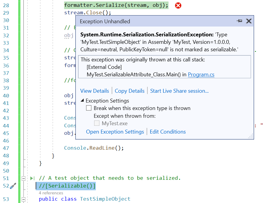 1, If we comment out Line 44, the Serializable Attribute, then we will get a SerializationException,