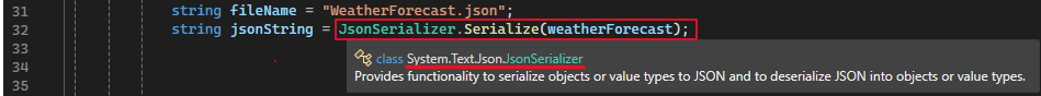 string jsonString = JsonSerializer.Serialize(weatherForecast);