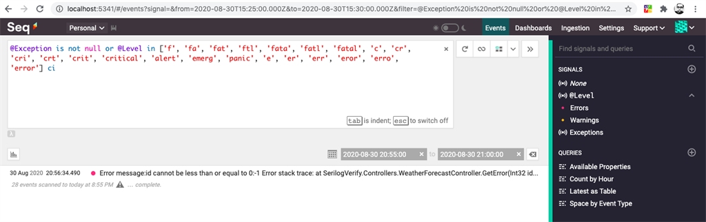 Now run the application & navigate to /api/error/0 and open the Seq by running http://localhost:5341
