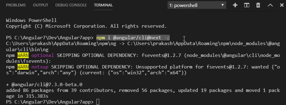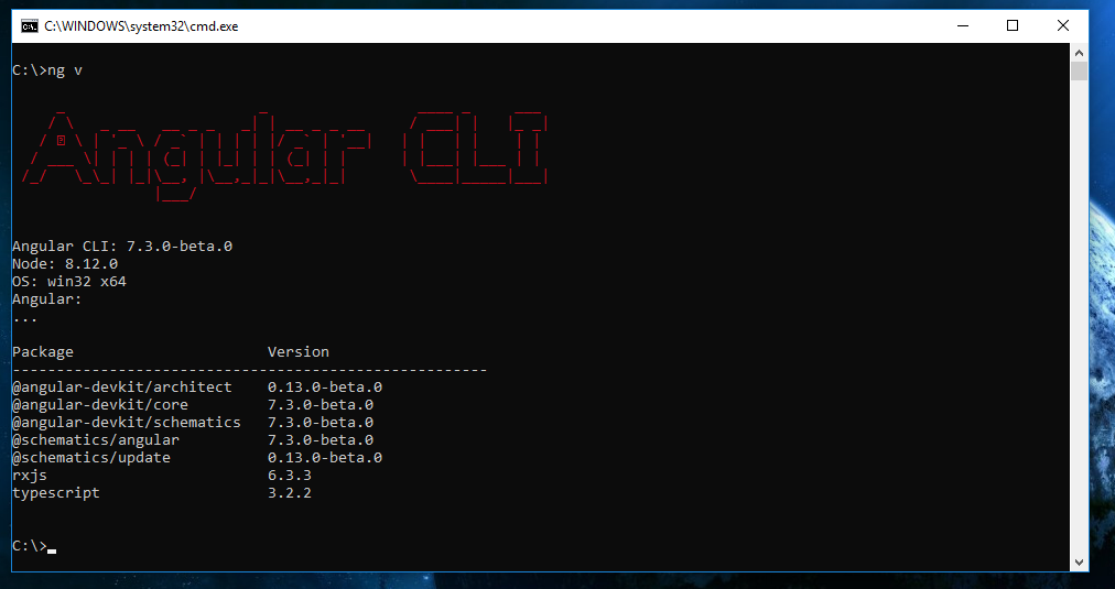 Now, the Angular 7 Beta version (7.3.0-beta.0) is installed on our machine, as shown in below image.