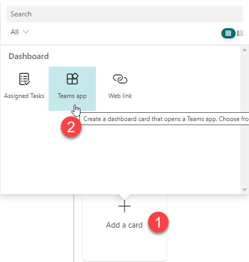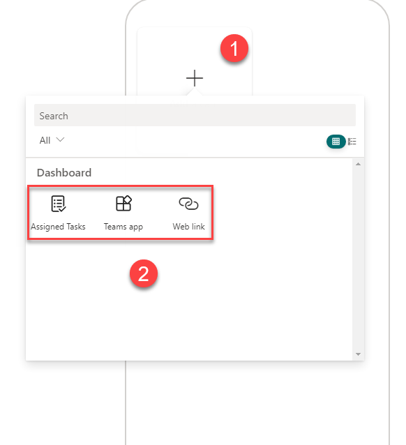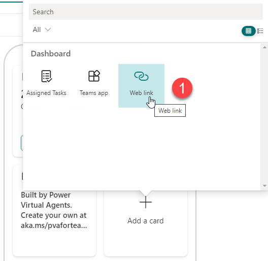 - At this moment, we can add three types of cards on the dashboard – Assigned Tasks, Teams app, and Weblink