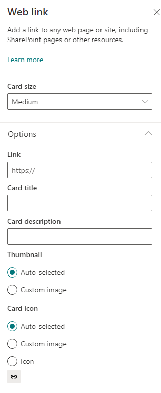 - Choose card size. Add Link, Card Title, and card description. Choose Thumbnail and Card icon.