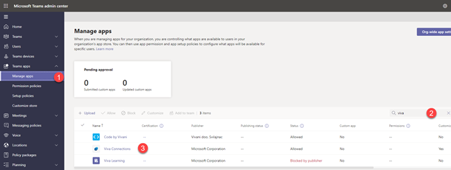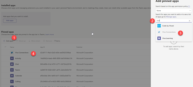 - Expand Teams app and click on Manage apps. Search for “Viva Connections”