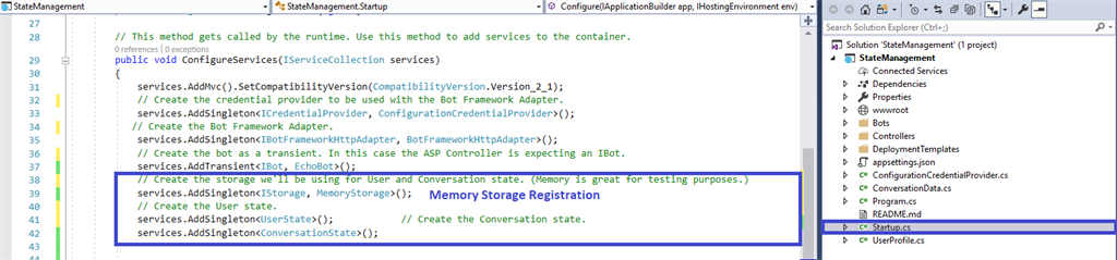 Register Memory Storage that is used to create User and Conversation objects. The user and conversation state objects are created at Startup and dependency injected into the bot constructor. Other services for a bot that are registered are - a credential provider, an adapter, and the bot implementation.
