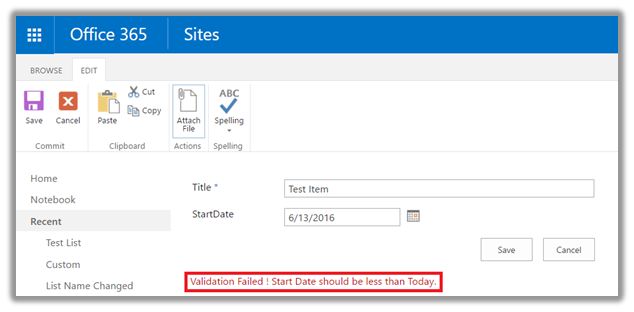 If both Column level and List level validations are present, Column validations are checked first followed by List validations. If column and list validations are in conflict data is never saved to the list. Before checking out how we can implement List validations using JSOM let’s see how we can do it out of the box.
