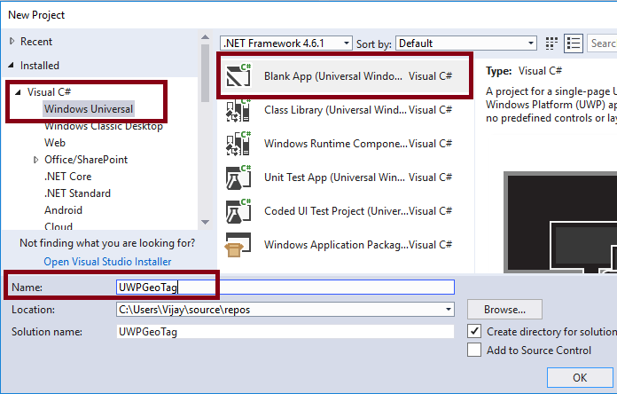 Open Visual Studio 2017. Go to Start -> New Project, select Windows Universal (under Visual C#)-> Blank App (Universal Windows). Give a suitable name for your App (UWPGeoTag) and click OK.